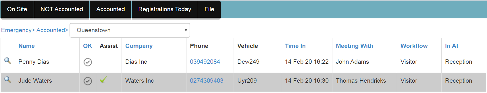 will show up in the 'Assist' column indicating the person(s) needing assistance. Evacuation assistance is determined in Self Registration, when 'Yes' is ticked in the 'Evacuation Assistance' field, the individual is flagged as needing assistance in the case of an emergency.