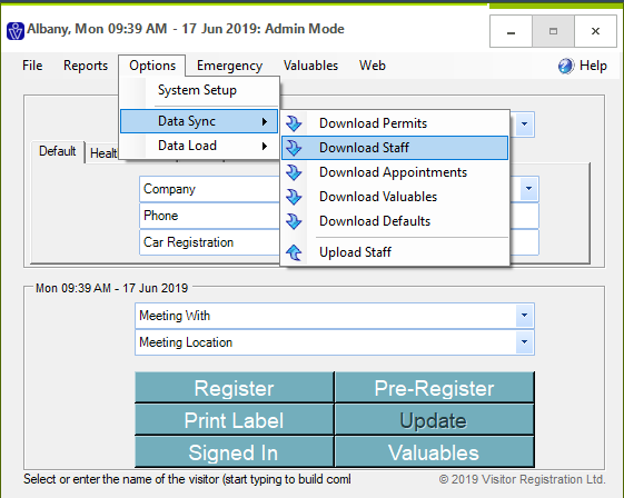 Open VisitorRego and navigate toOptions> Data Sync> Download Staff