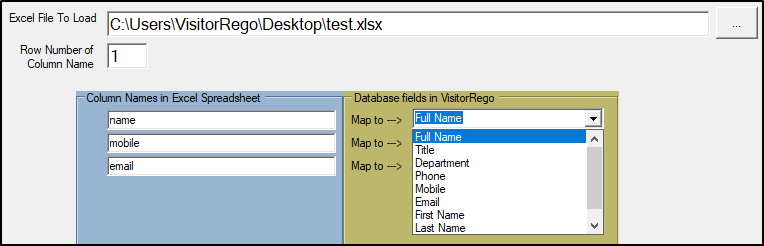 VisitorRego is able to load staff from an Excel spreadsheet. The process of loading staff from an Excel spreadsheet involves mapping database fields.