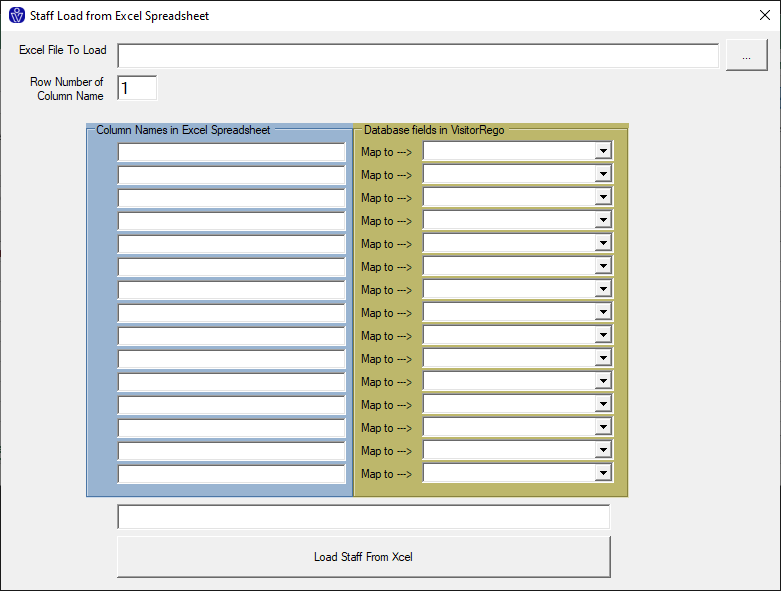 The Staff Load from Excel Spreadsheet window will open allowing you to select the file and map the columns in the spreadsheet to the fields in the VisitorRego database.