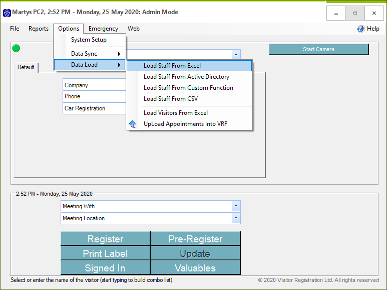 1. From VisitorRego's Admin mode choose Options> Data Load> Load Staff from Excel.