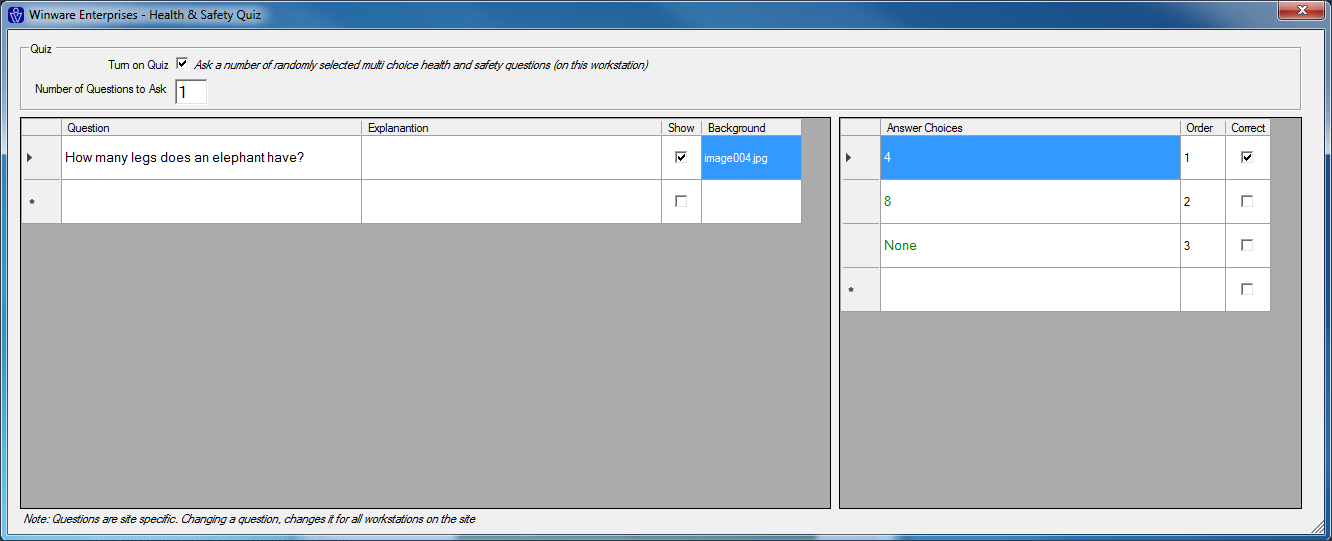 5. Check the Show check box to display the question in the Health & Safety Quiz.