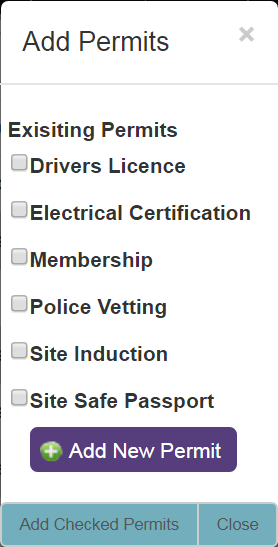 In the Company Permits and Insurance section, press the Add Permits button. The Add Permits pop up will display any permits that have already been set up. If you need a permit that is not on the list you can add this by clicking the Add New Permit ...